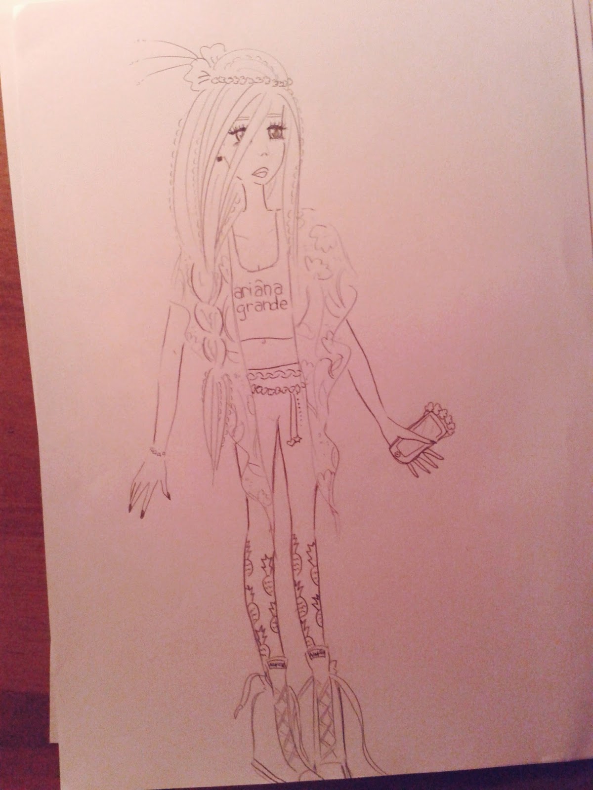 Znači Maja se zasigurno pita otkud ovo originalno ime hahah znači inspiracija je došla s jedne meni posebno drage Majine majice na kojo piše Fashion Maniac hehe eto sad vam tu 4 neprofesionalno uslikana crteža... hope u like it ;)Ovaj prvi rad mi je zapravo i najbolji jer je on BIO prvi. A ja sam uvijek inspirirana na početku a poslije kako bude :) Ova cura ima pre dobru kosu ispunjenu malim pletenicama i to mi je kjuut. Ima iPhone i pre dobru maskicu za nju. Tajice imaju pri dnu ananase i to je pre dobro hahahha kao ja volim hvalit samu sebe. Ima visoke starke s petom, kimono na cjetiće kakvog imate i u H&M i crop majicu na kojoj piše Ariana Grande heh. Pletenica <33